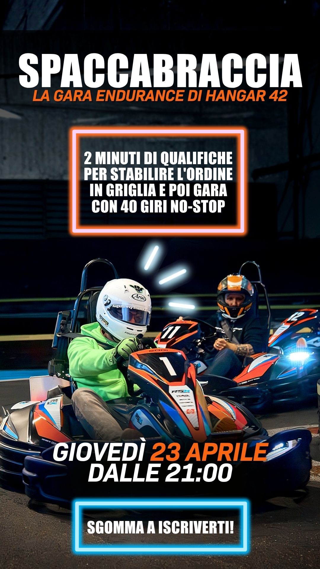 I kart elettrici sfrecciano nel circuito indoor di Hangar 42, in una pista in vero asfalto, per avvincenti gare in compagnia.